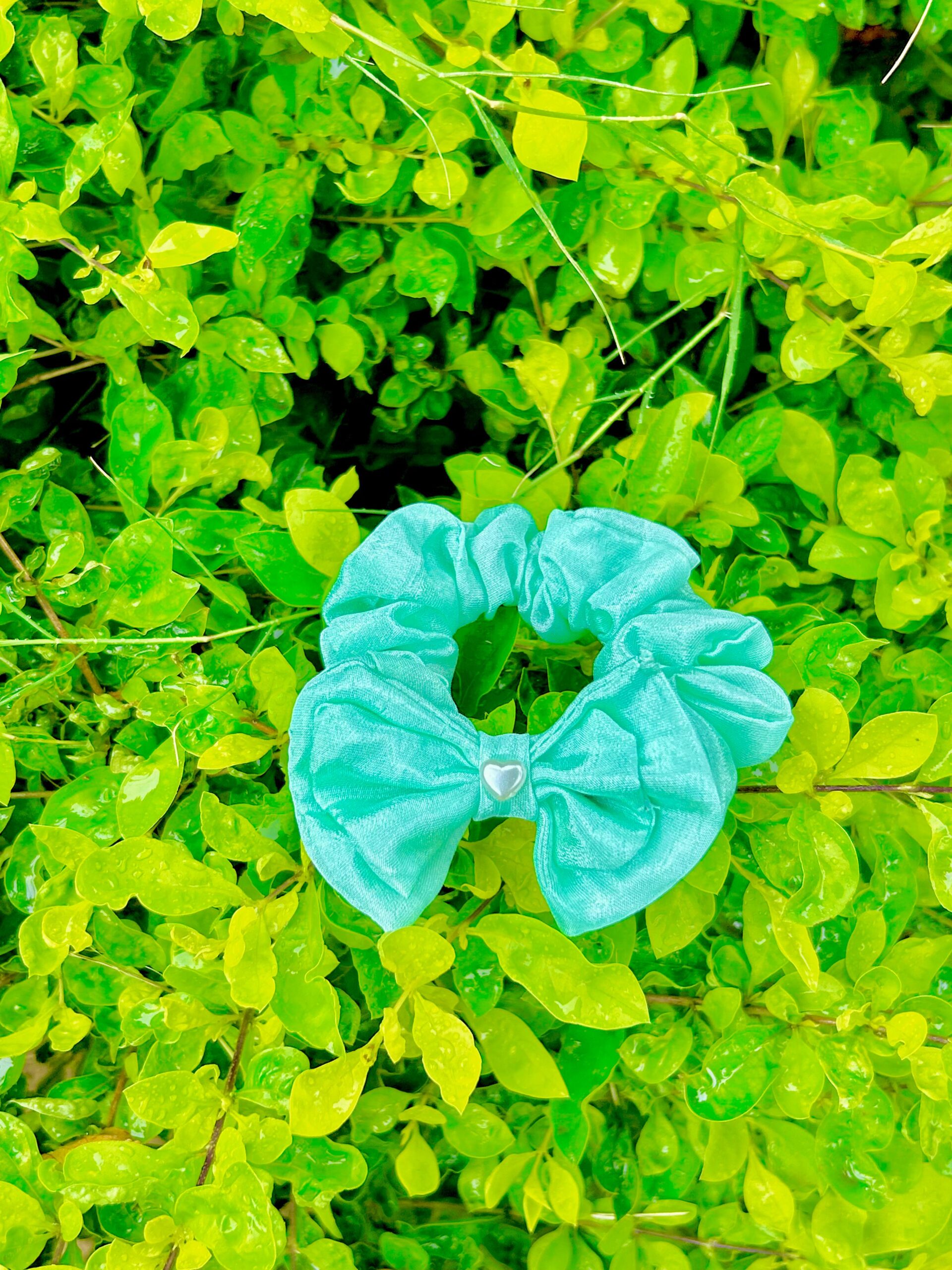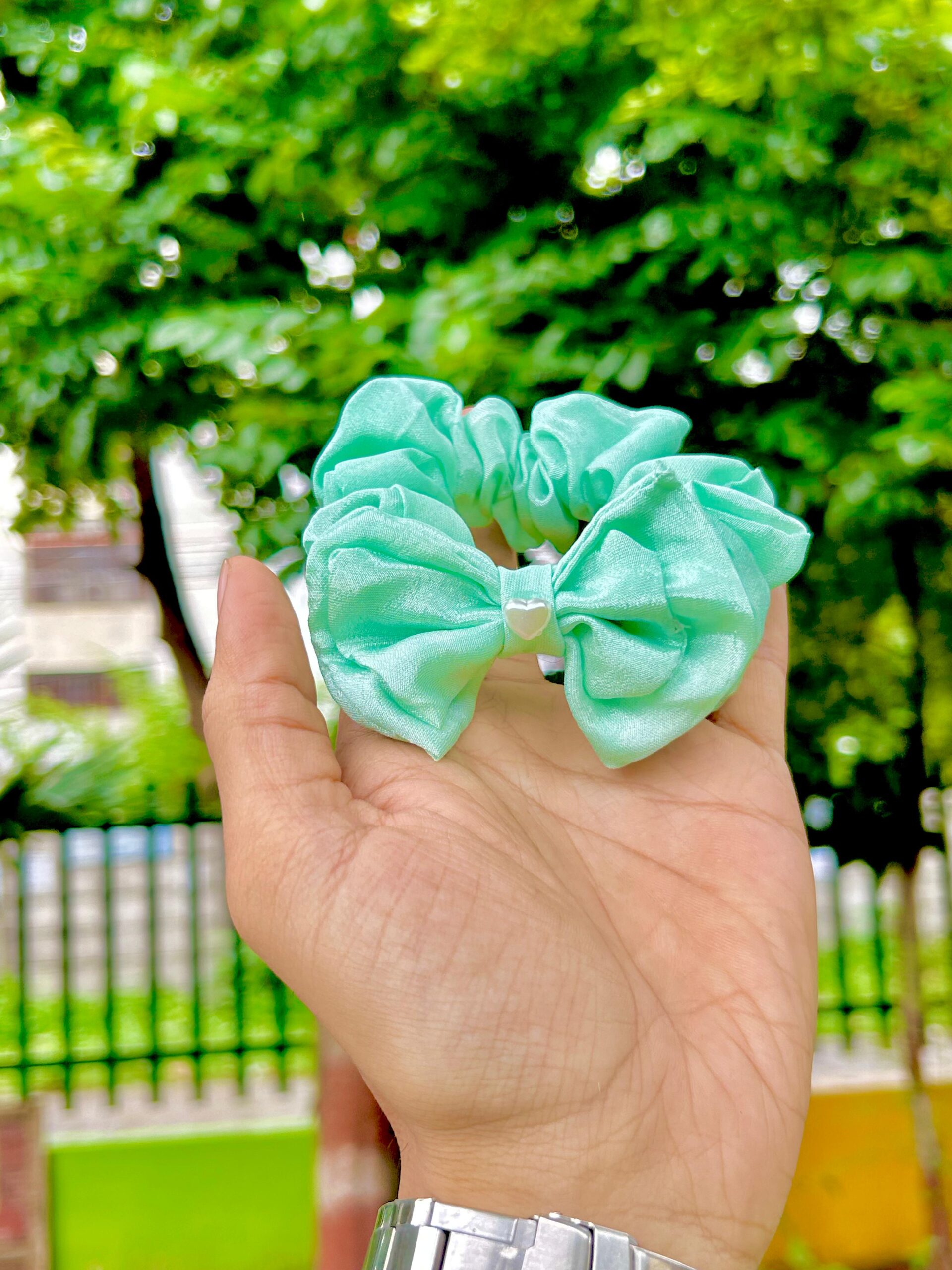 Handmade Bow style Turquoise Satin Fabric Hair Scrunchies , Hair Ties, Rubber Band For Womens And Girls