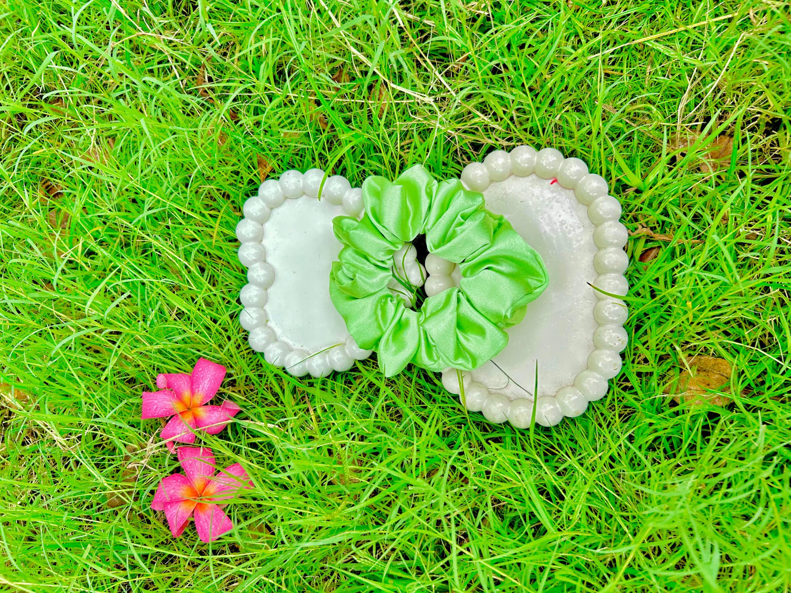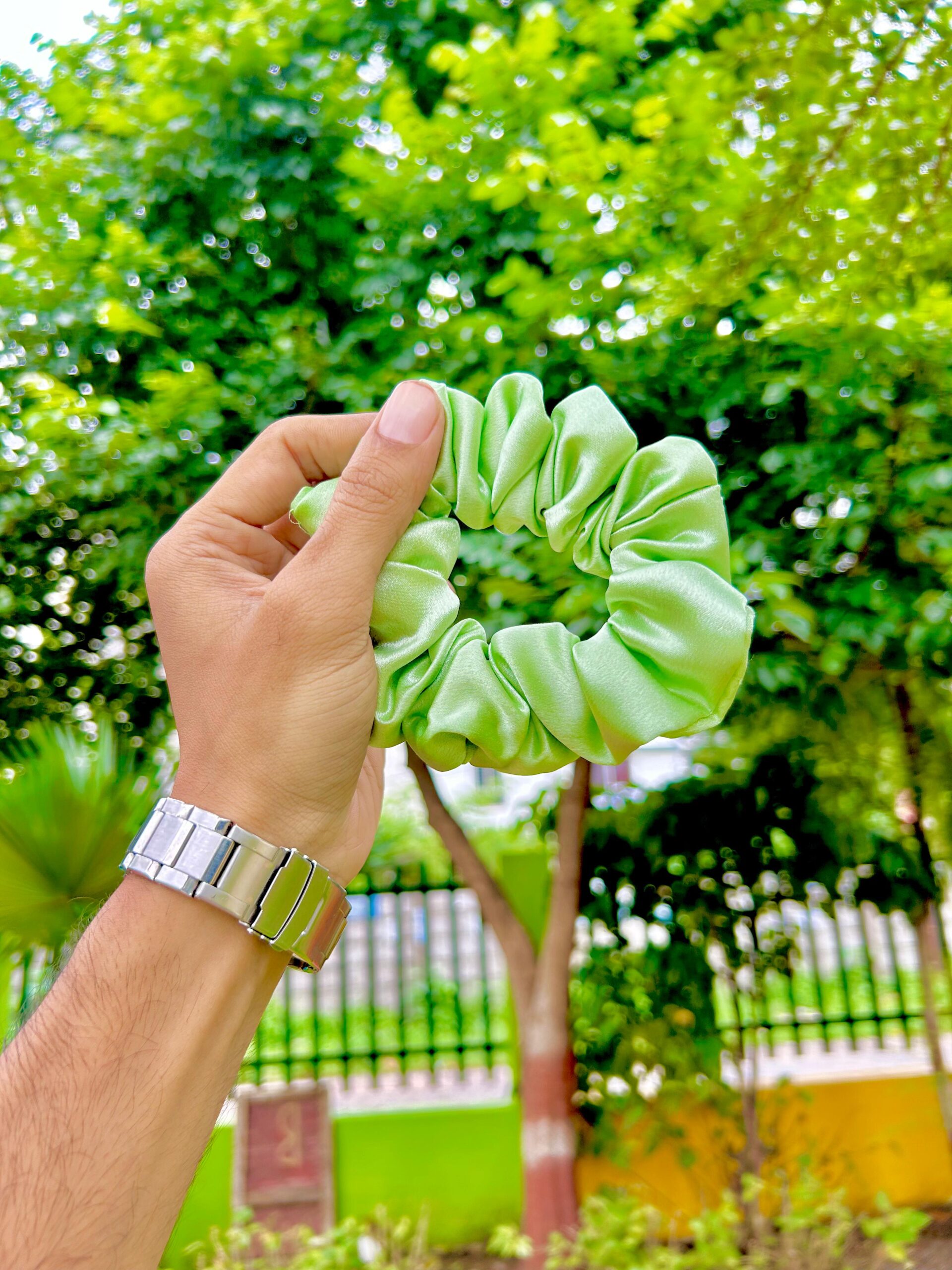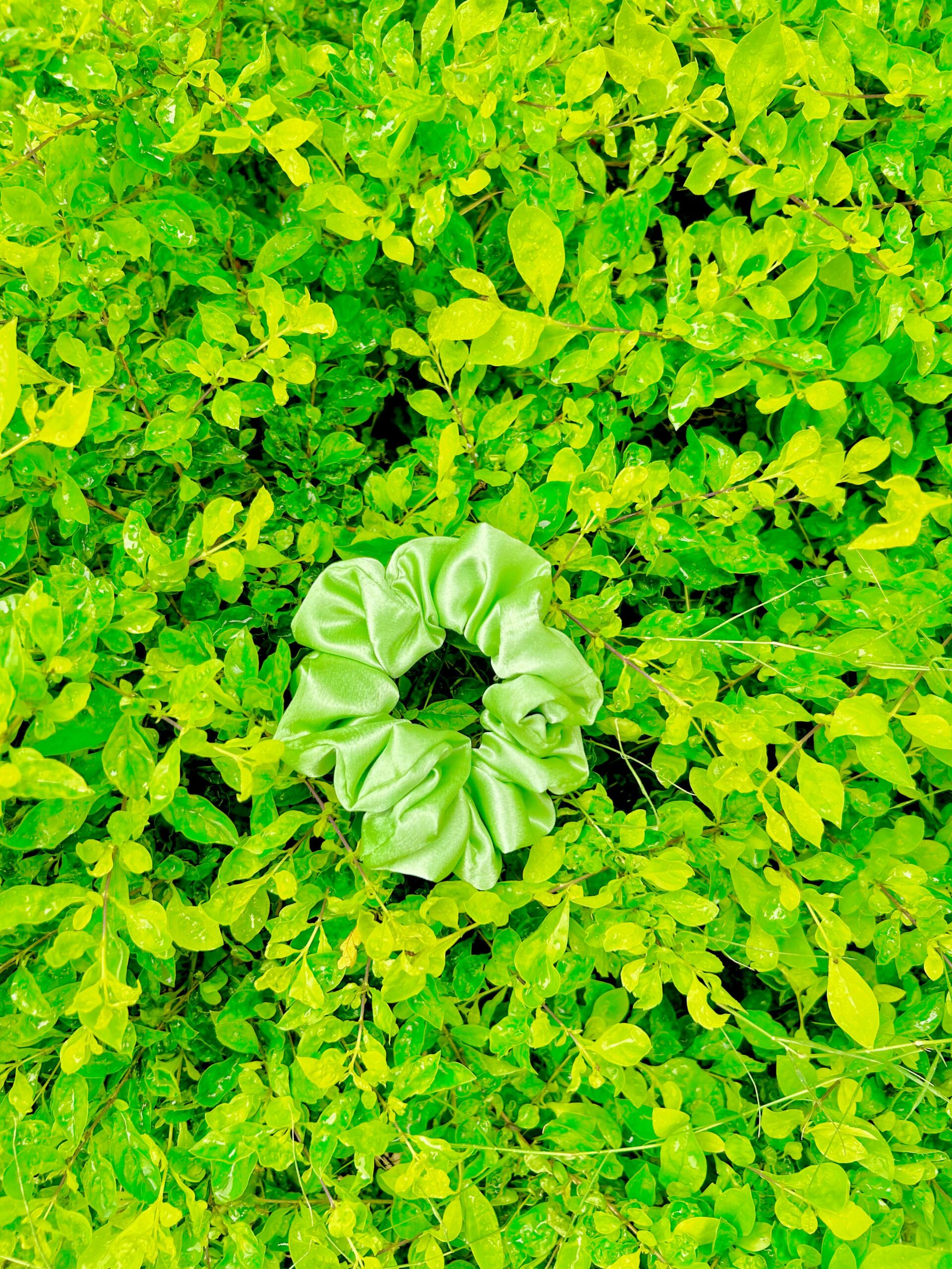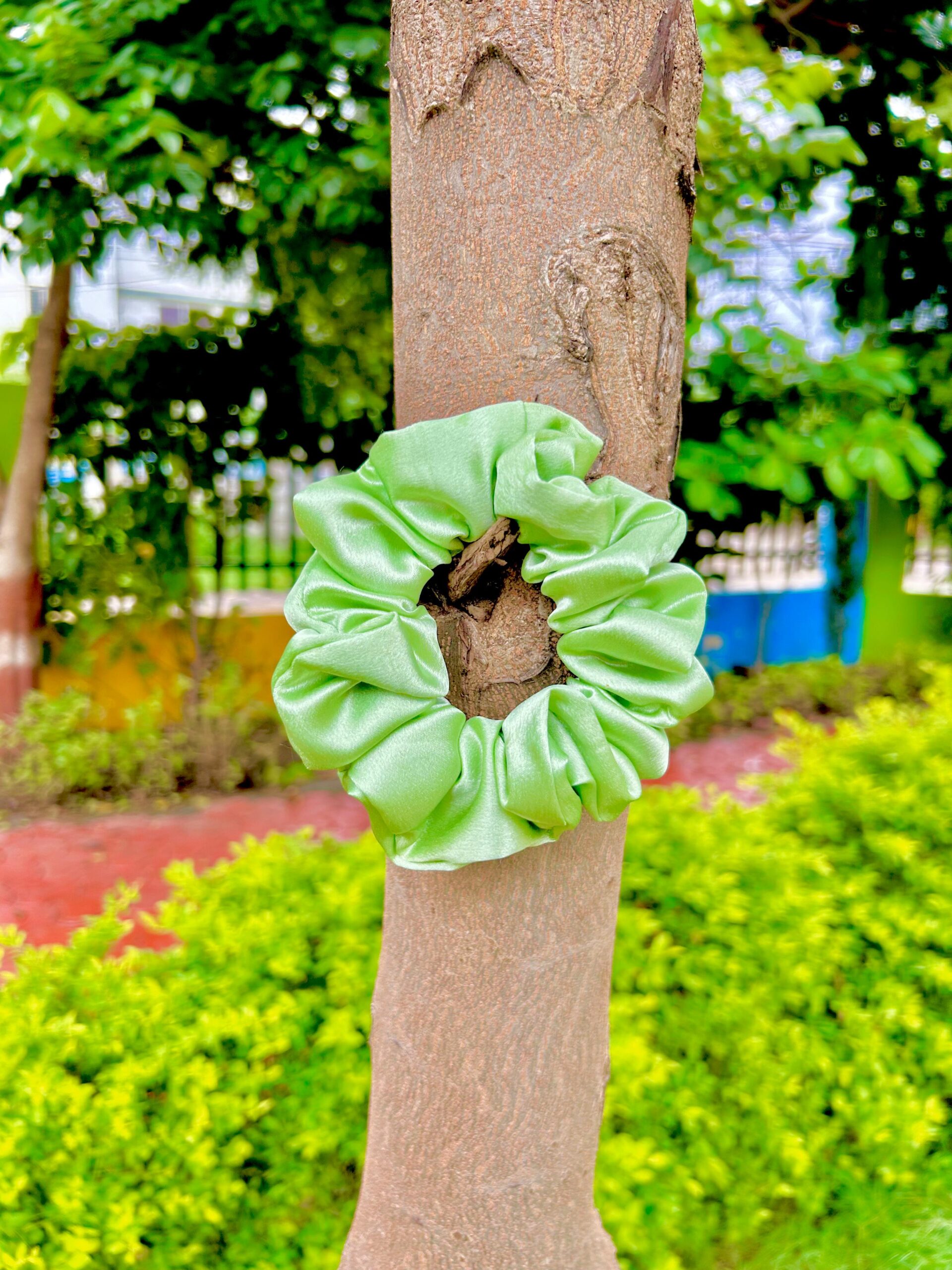 Handmade GREEN Satin Fabric Hair Scrunchies , Hair Ties, Rubber Band For Womens And Girls