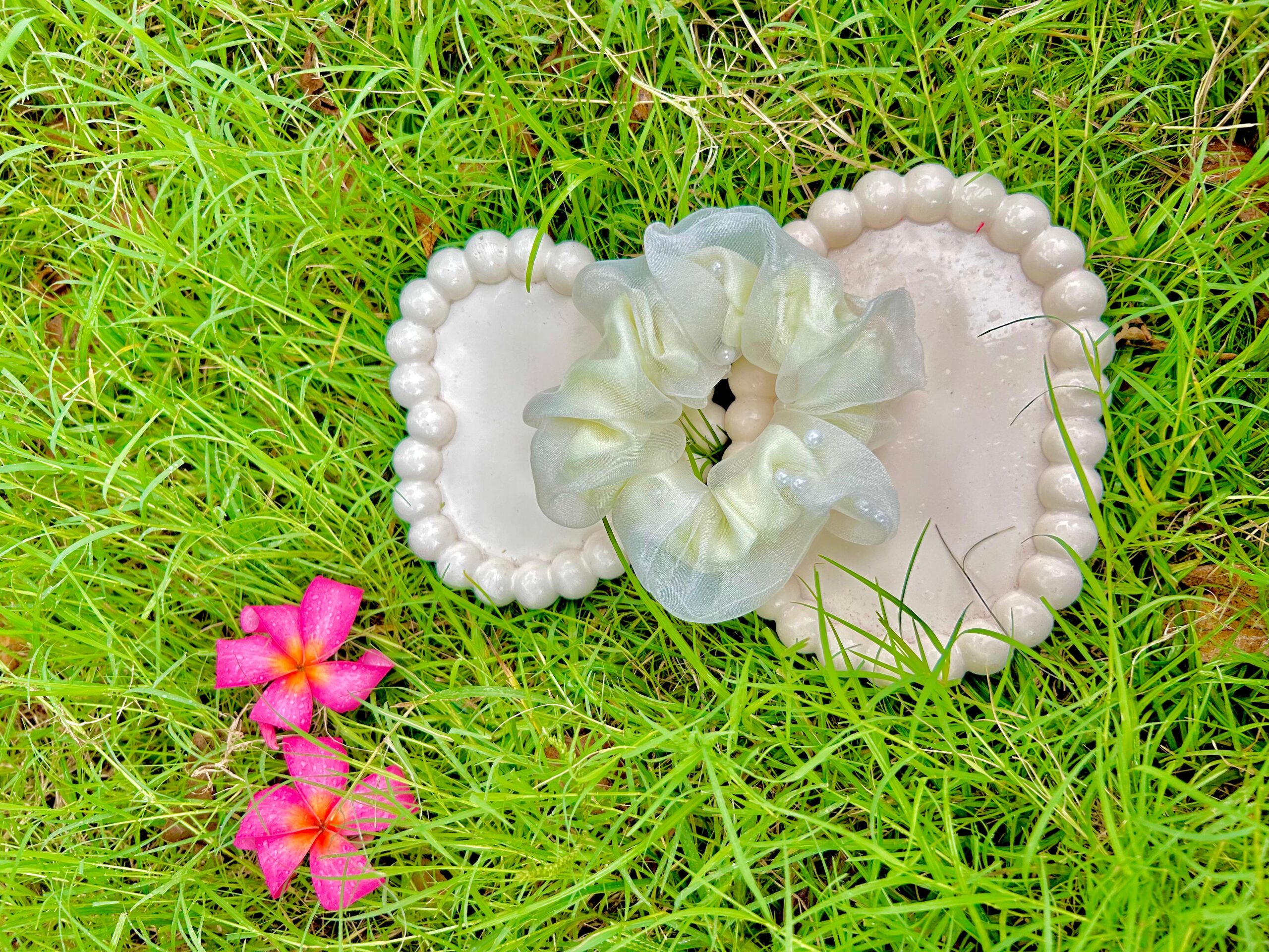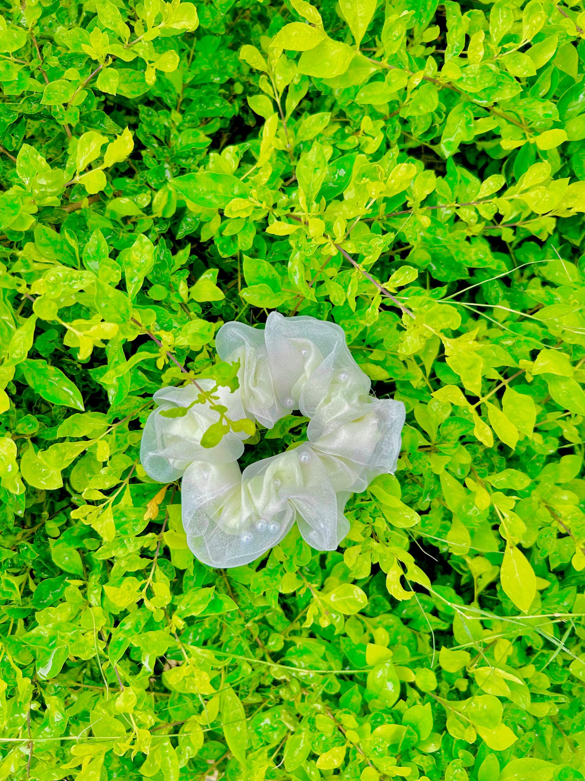 Handmade White Pearl Net Fabric Hair Scrunchies , Hair Ties, Rubber Band For Womens And Girls
