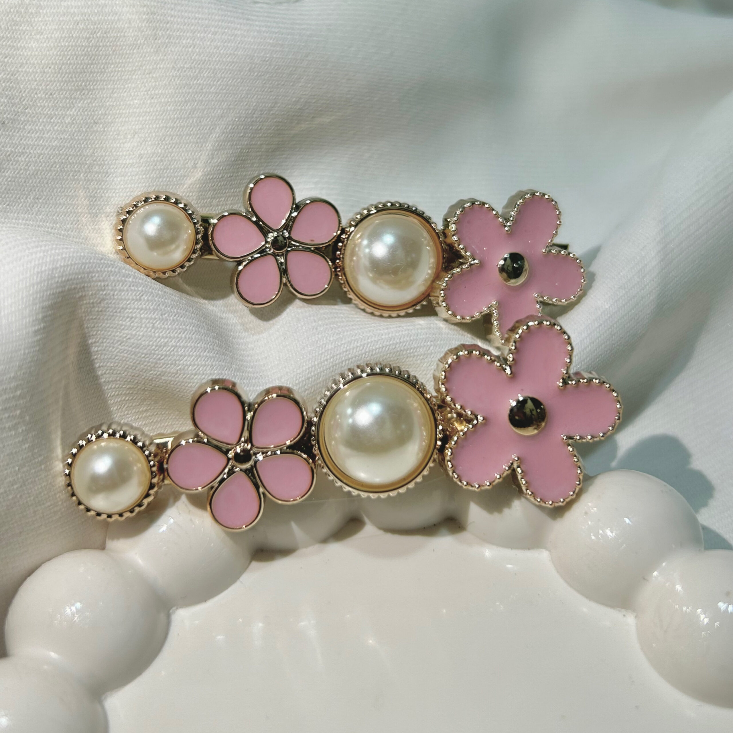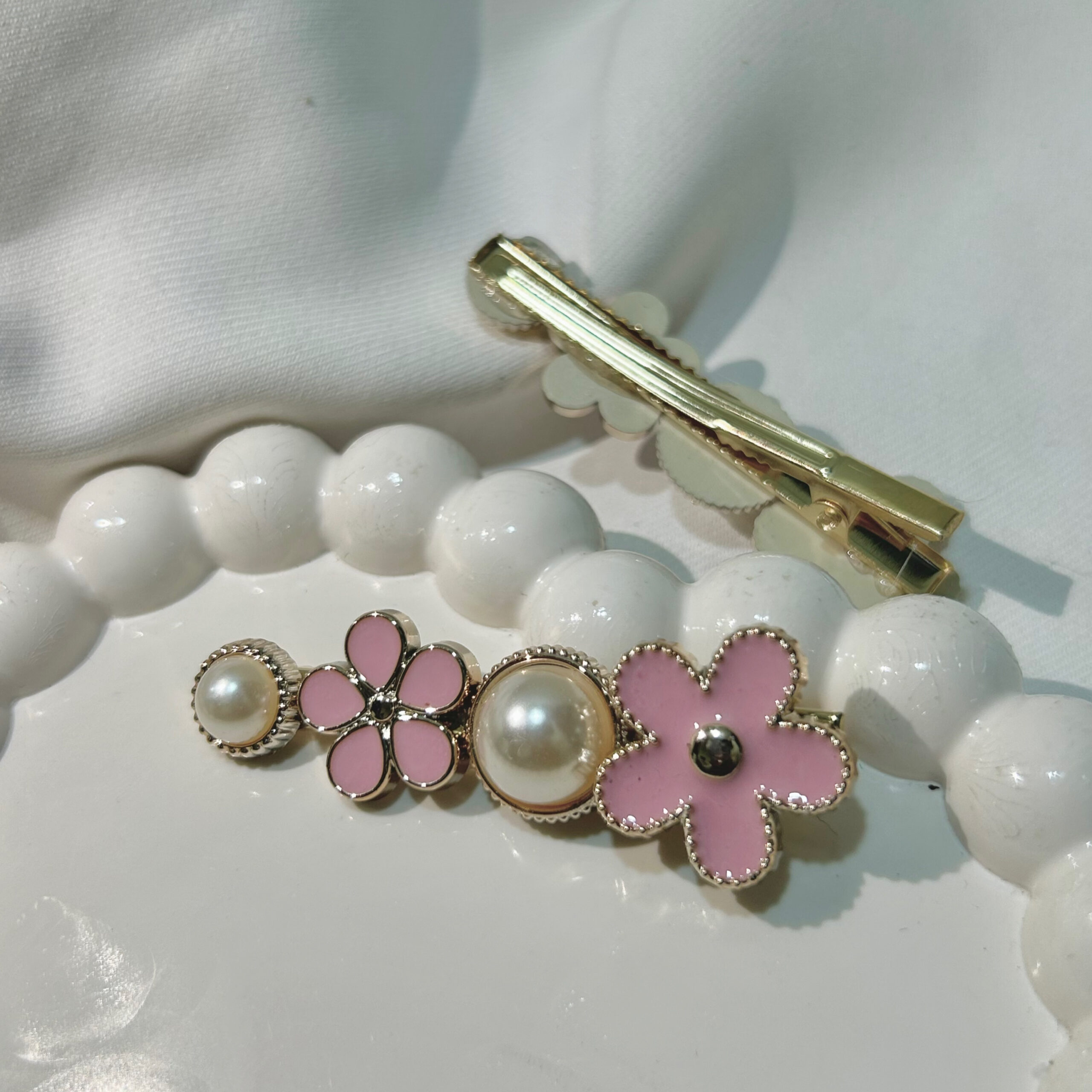 Pink Flower Hair Clips Set with Golden Flowers, Elegant Korean Style Hair Accessories for Women, Gold-Tone