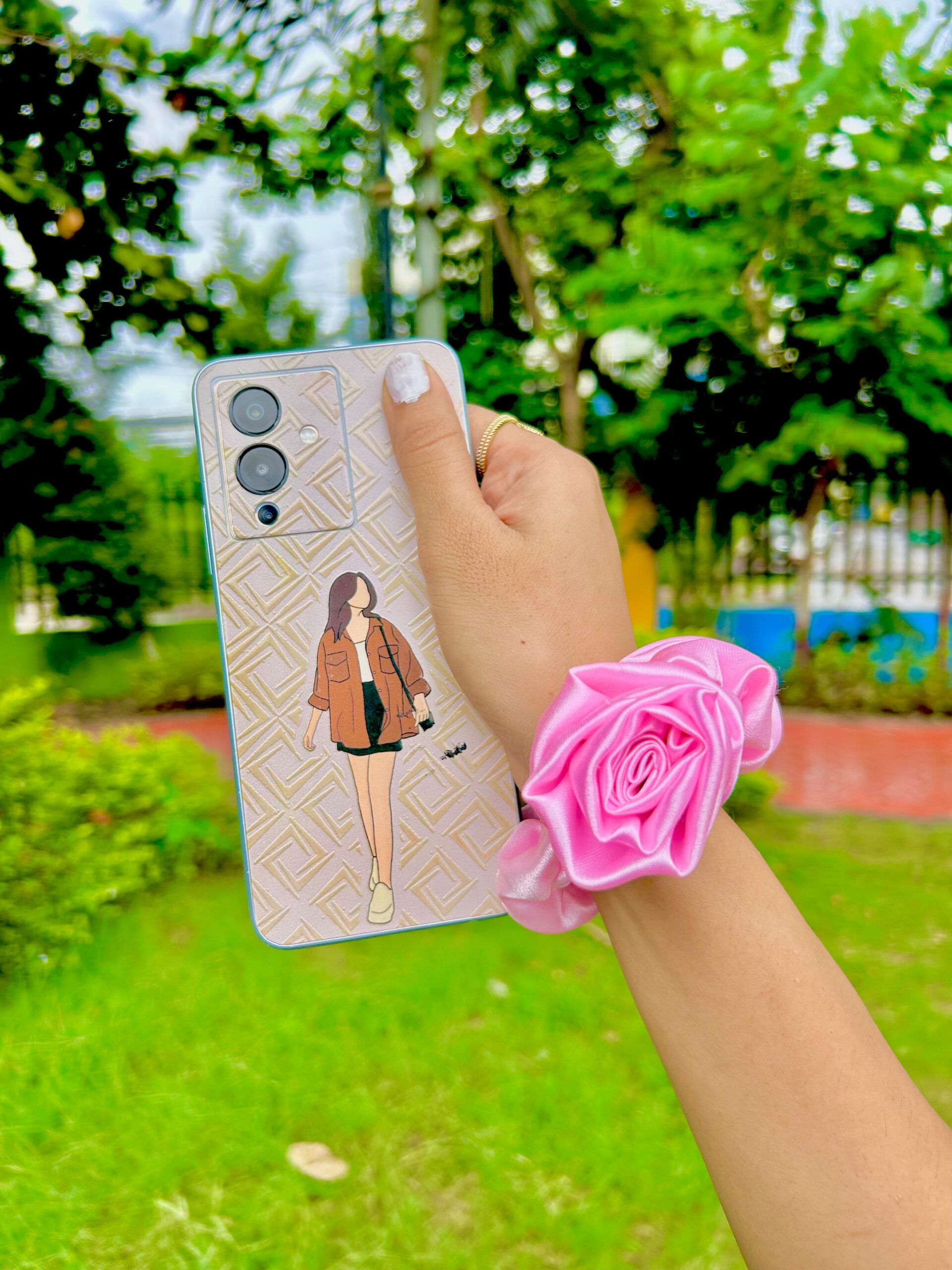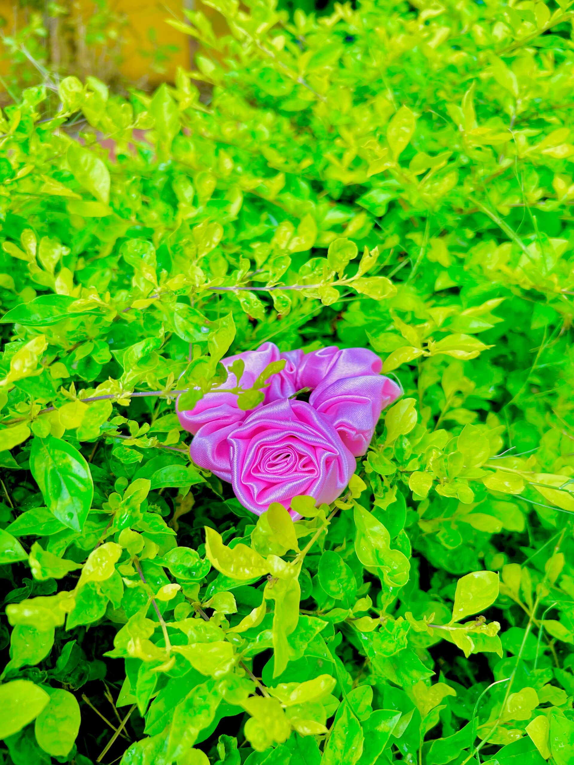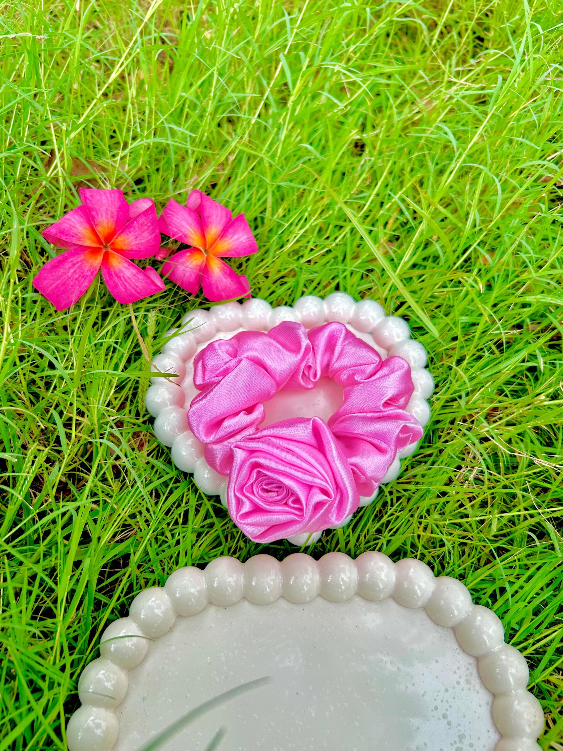Satin Pink Flower Scrunchie, Hair Ties, Rubber Band For Womens And Girls, Red