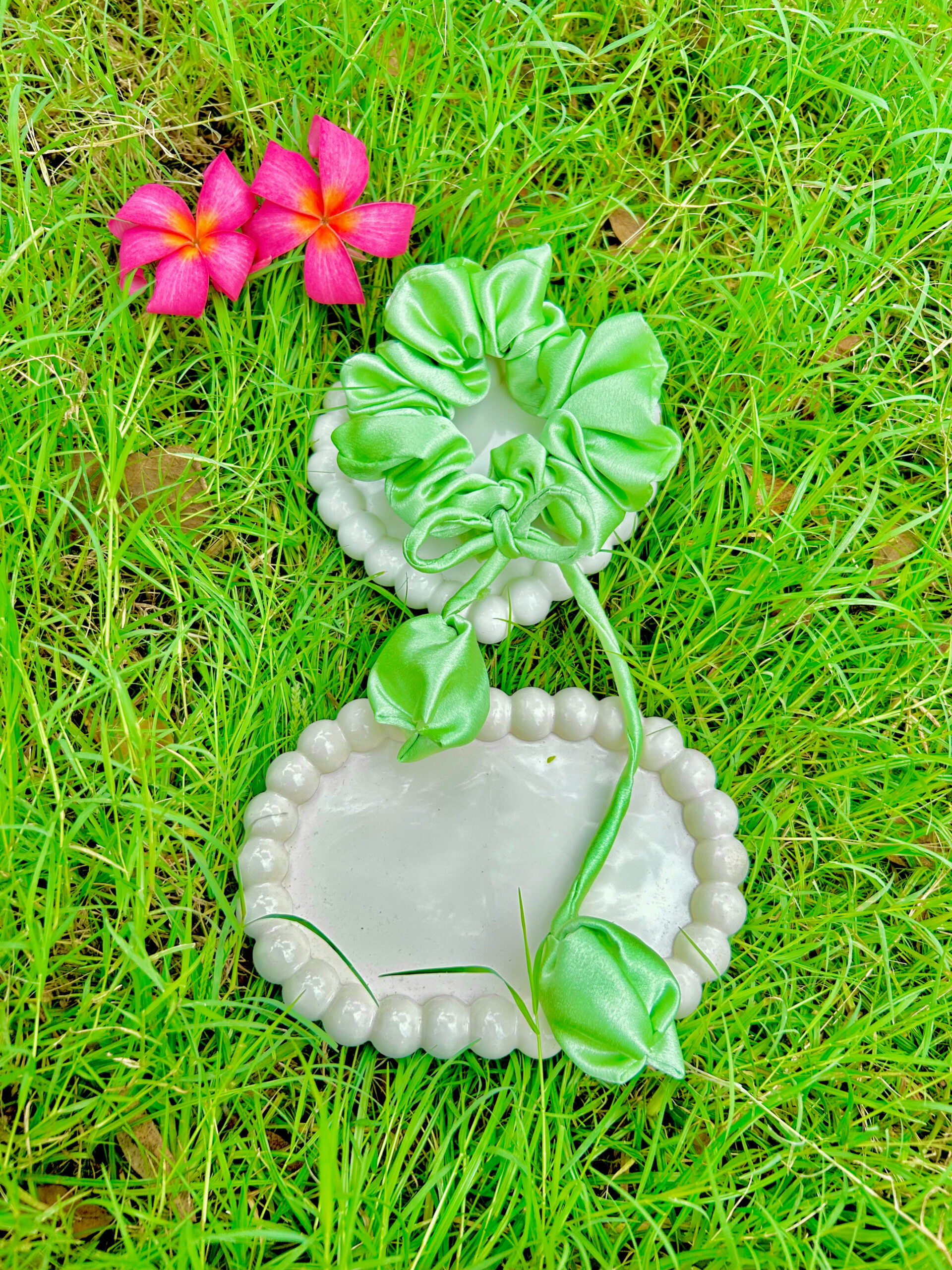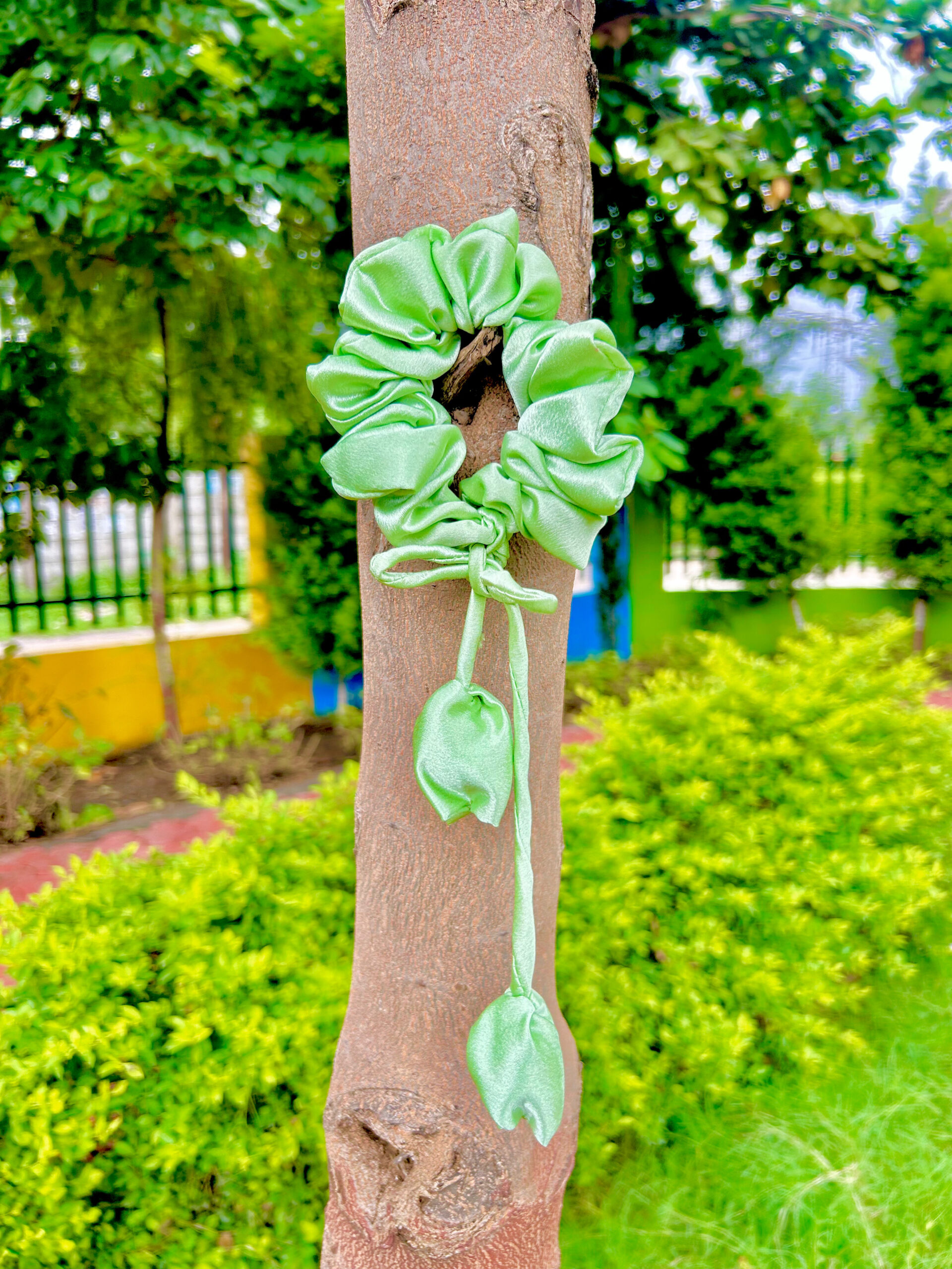 Satin Tulip Ribbon Green Intestine Loop Scrunchie, Hair Ties, Handmade Rubber Band For Womens And Girls, Green