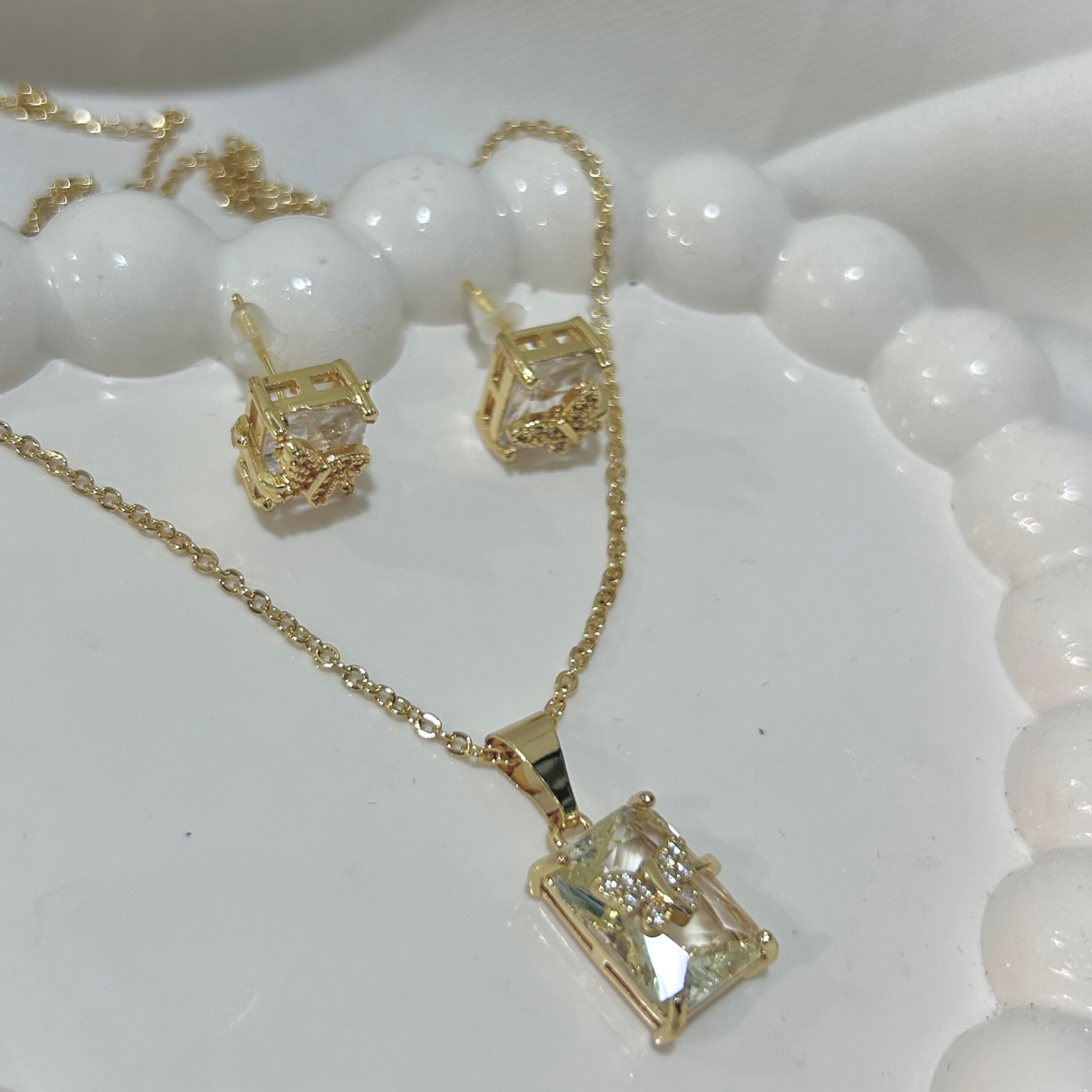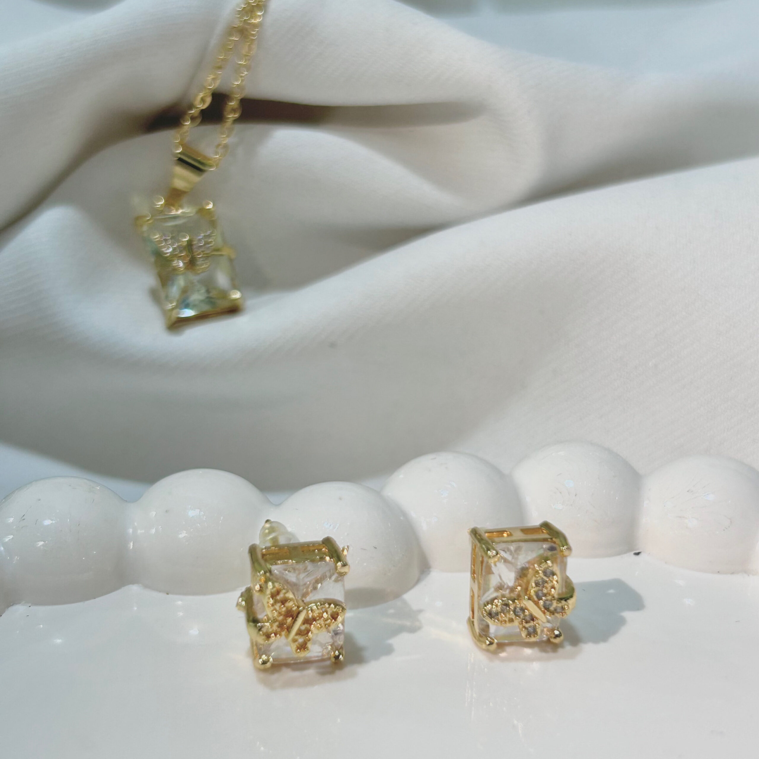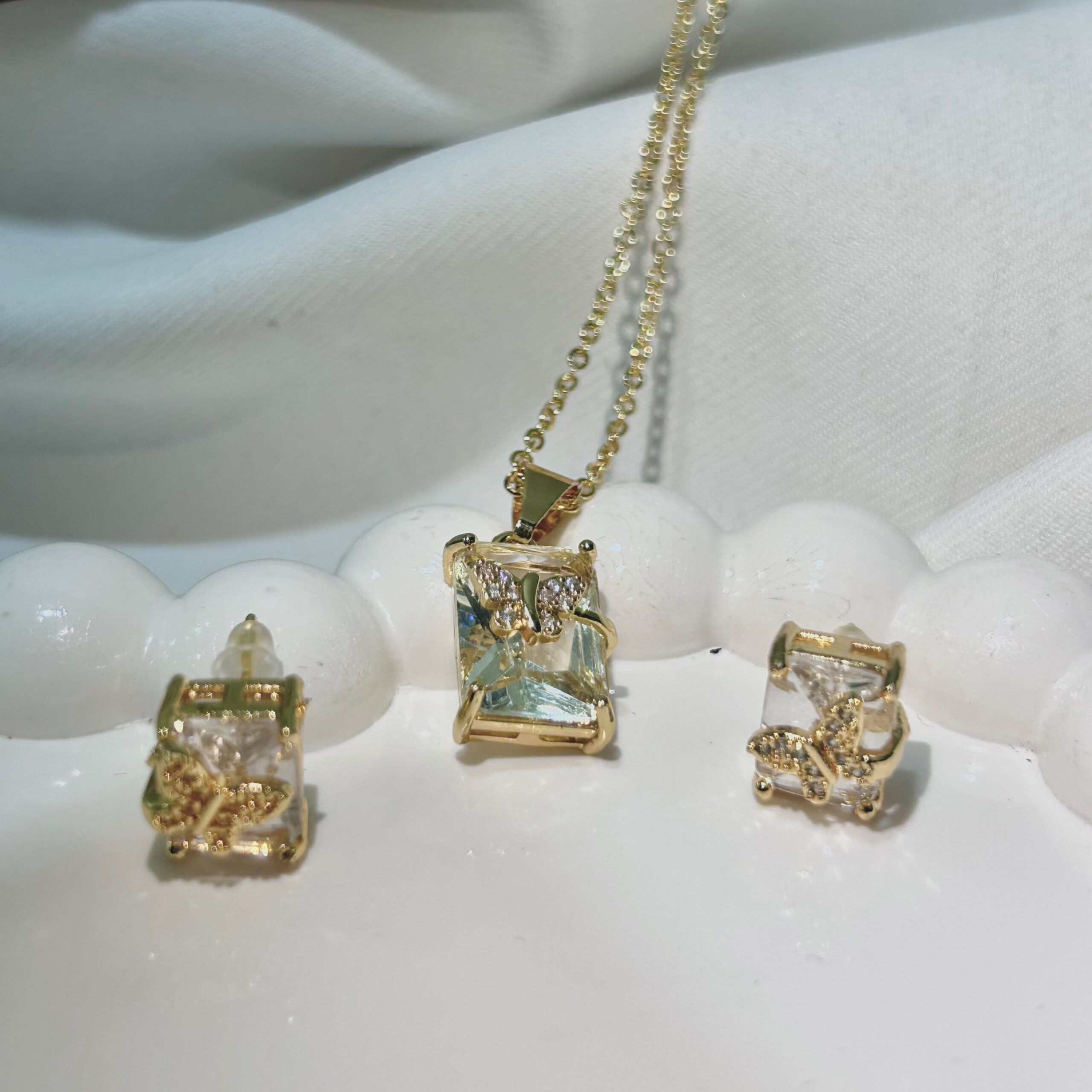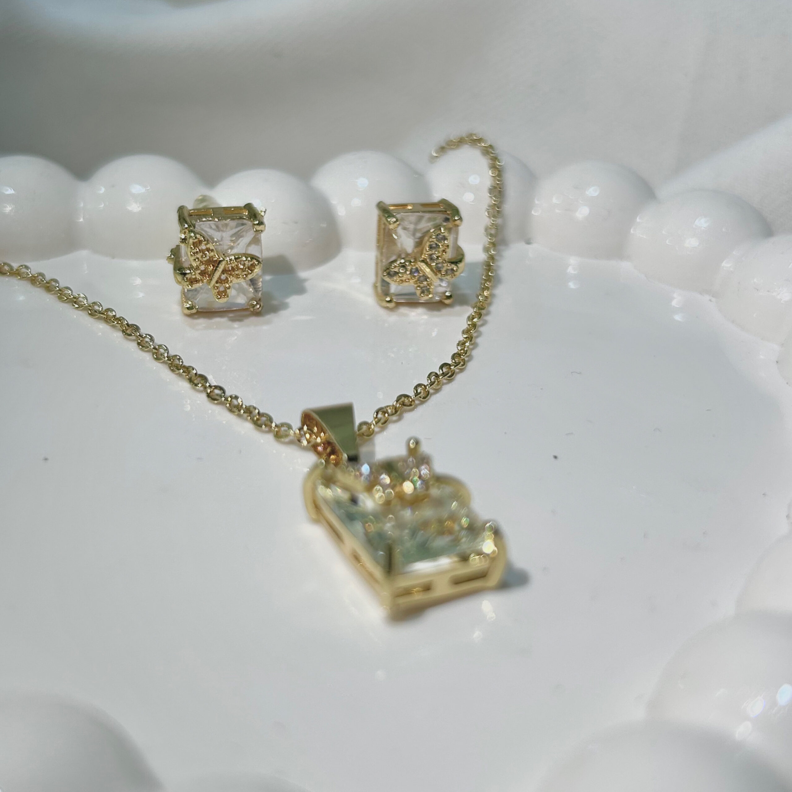 White Trancpreant Butterfly American Diamond Studded Square & Leaf Shaped Pendant With Earrings For Girls and Women